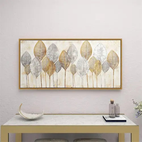 - Este arte de pared dorado contemporáneo presenta un lienzo con marco rectangular y una pintura de hojas.